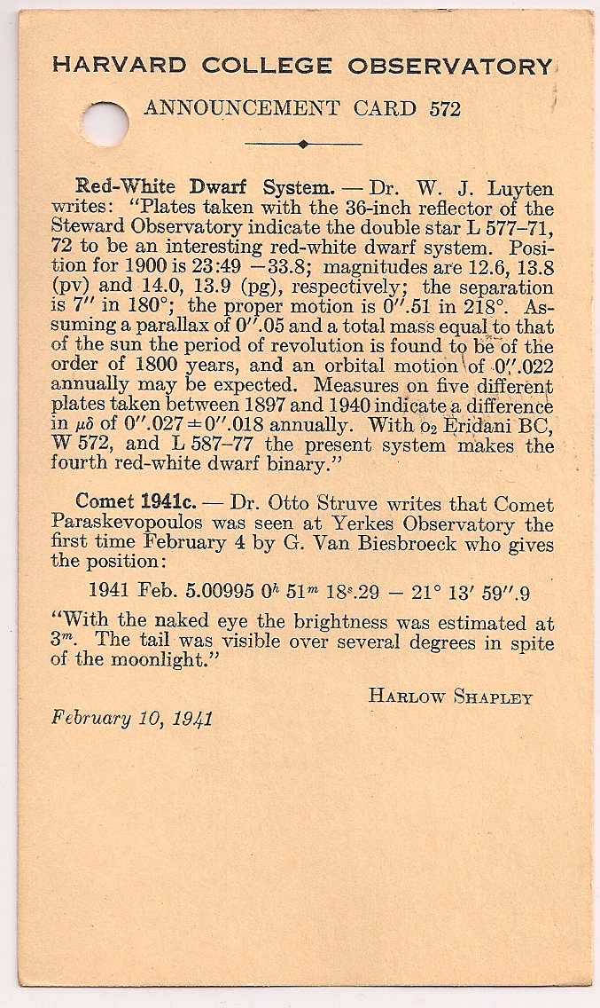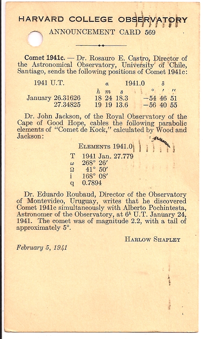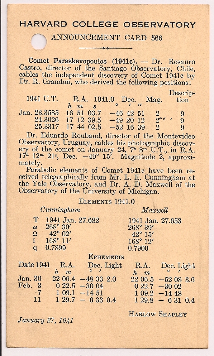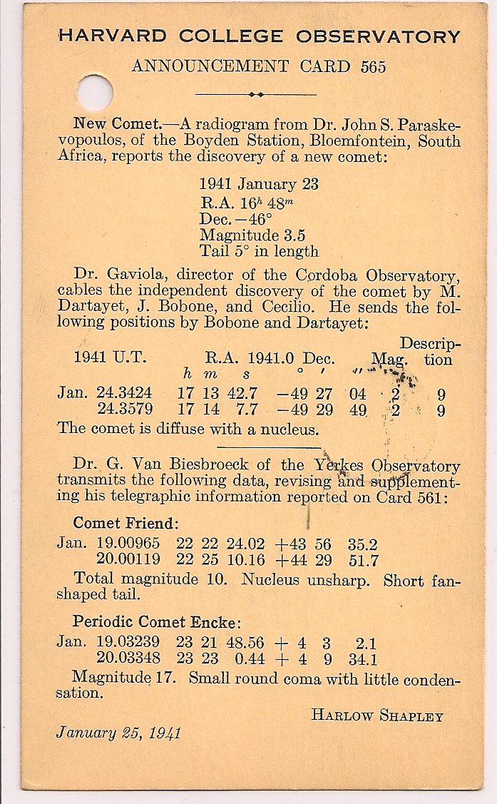The bright comet C/1941 B2 (de Kock-Paraskevopoulos) appears on